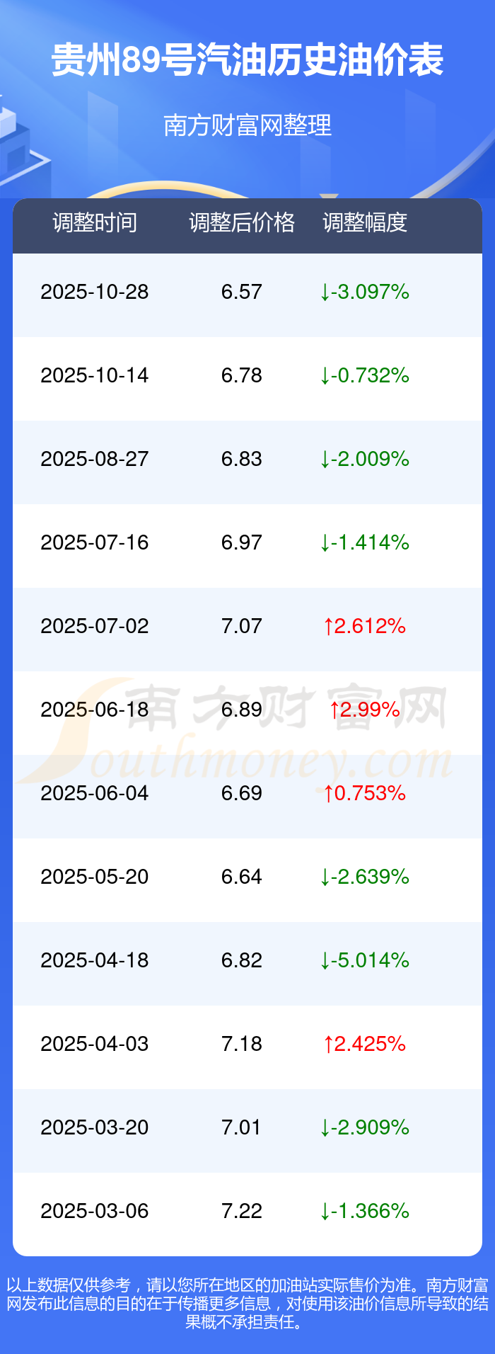 11月3日,貴州89號汽油的價格是6.57元每升,本次的調(diào)整時間為10月28日,對比上次的調(diào)整跌了0.21元,跌3.097%,11月10日24時為下一輪油價調(diào)整時間,還有7.92天。