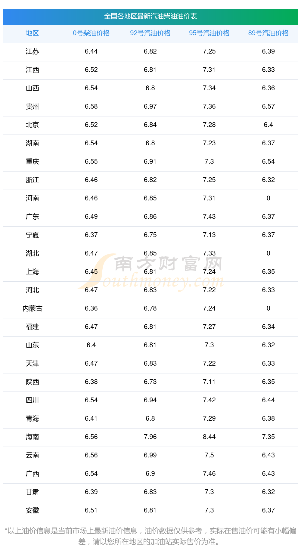 油價數(shù)據(jù)僅供參考,請以您所在地區(qū)的加油站報價為準。南方財富網(wǎng)發(fā)布此信息的目的在于傳播更多信息,對使用該油價信息所導致的結果概不承擔任何責任。