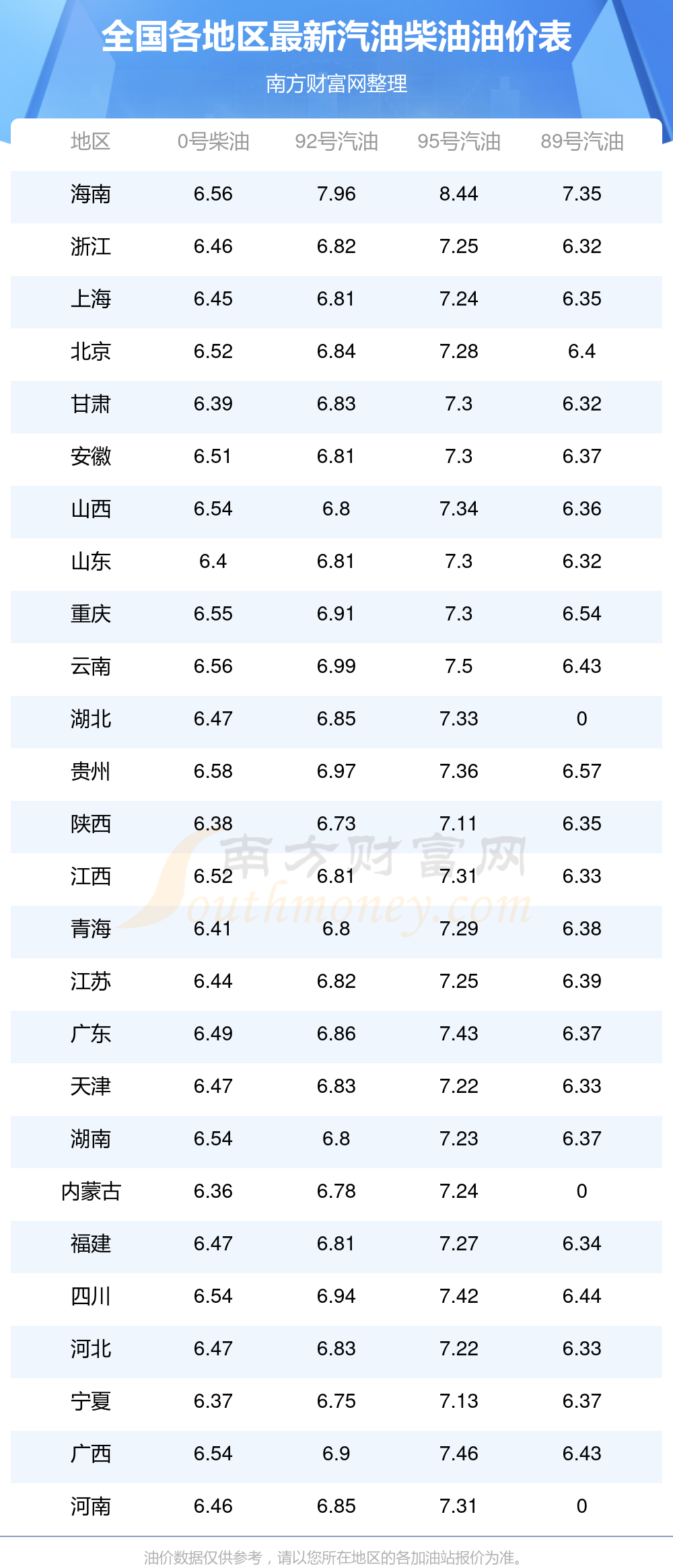 0號柴油平均價(jià)格:6元每升,其中,最高為貴州,價(jià)格為6.58元/升,最低為內(nèi)蒙古,價(jià)格為6.36元/升。