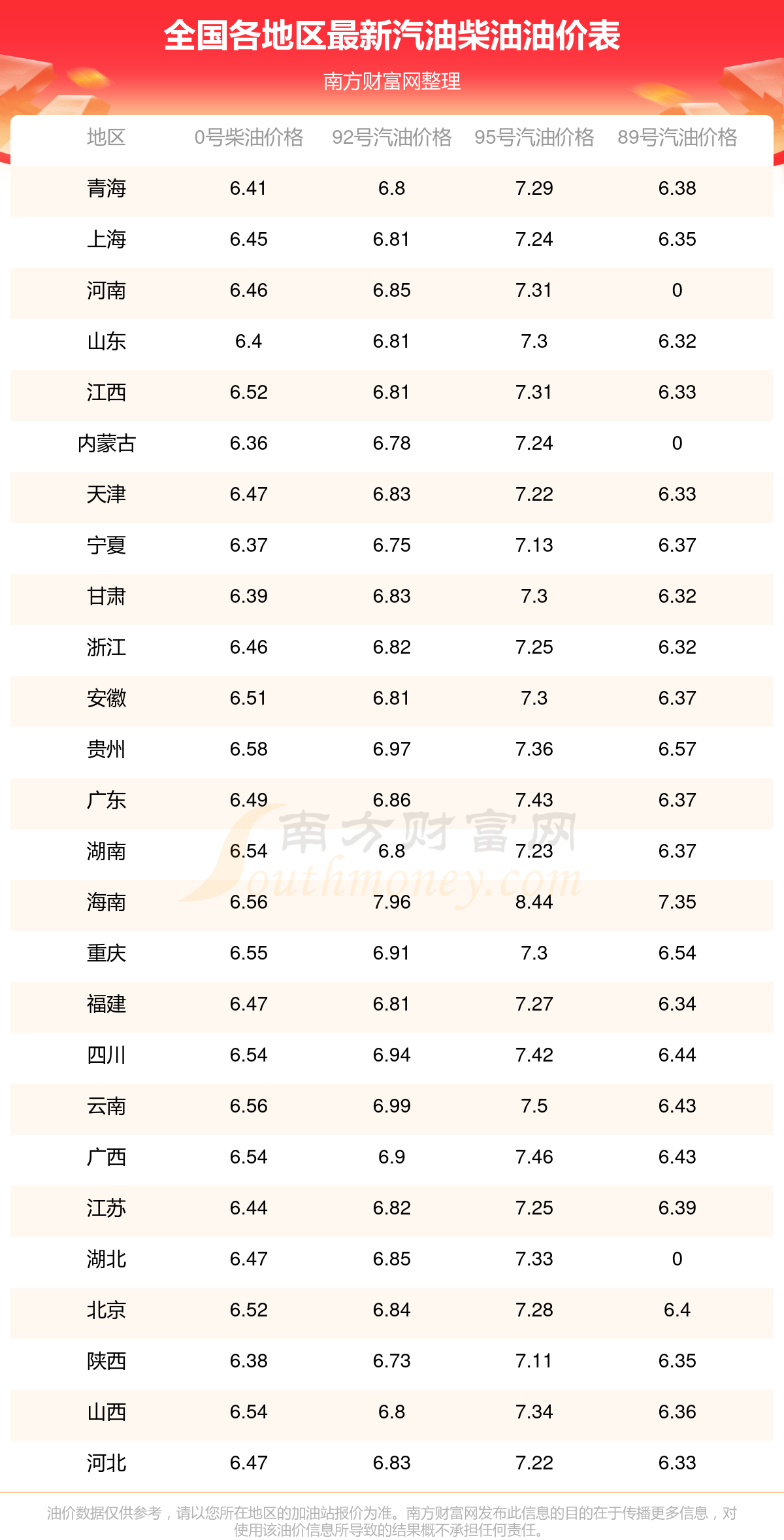 2025年11月3日全國各地汽油價(jià)格表一覽