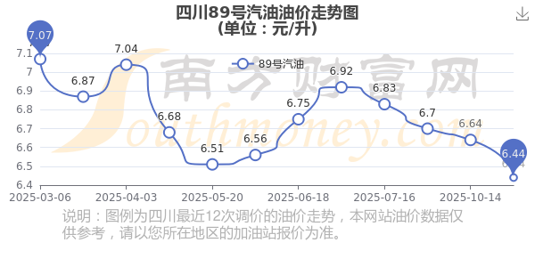 11月3日,四川89號汽油的價格是6.44元每升,本次的調(diào)整時間為10月28日,對比上次的調(diào)整下跌了0.2元,下跌3.012%,11月10日24時為下一輪油價調(diào)整時間,還有7.92天。
