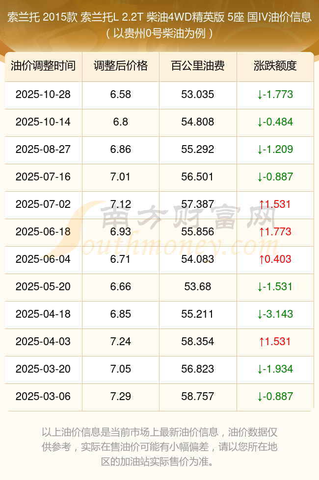 按照10月28日0號柴油最新調(diào)整價格6.58元/升來計算(以貴州為例),該車型百公里平均油費為53.035元,按照上一輪10月14日調(diào)整價格6.8元/升來計算,百公里平均油費為54.808元,對比上一輪少花1.773元,下一輪油價調(diào)整時間為11月10日24時。