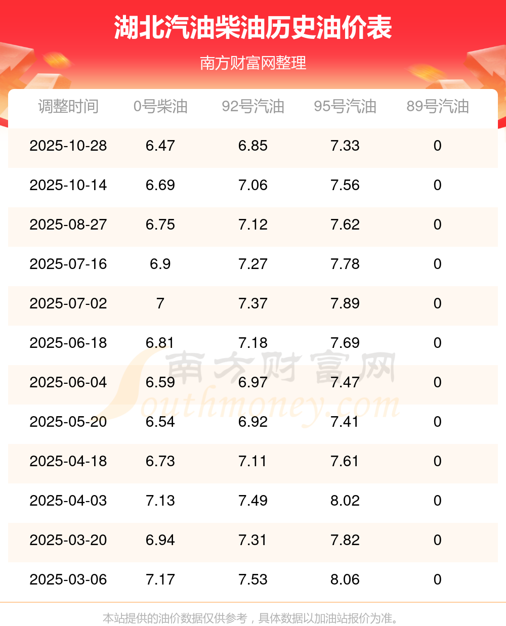湖北2025年最新汽油柴油歷史油價(jià)表