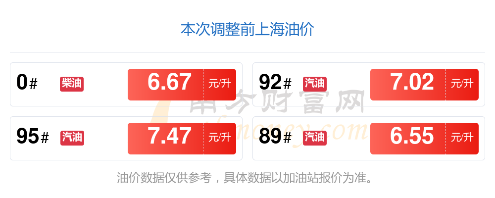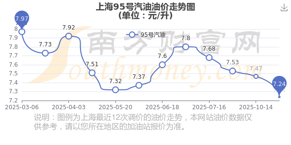 11月3日,上海95號汽油的價格是7.24元每升,本次的調整時間為10月28日,對比上次的調整跌了0.23元,跌3.079%,下次調整時間為11月10日24時,還有7.92天。