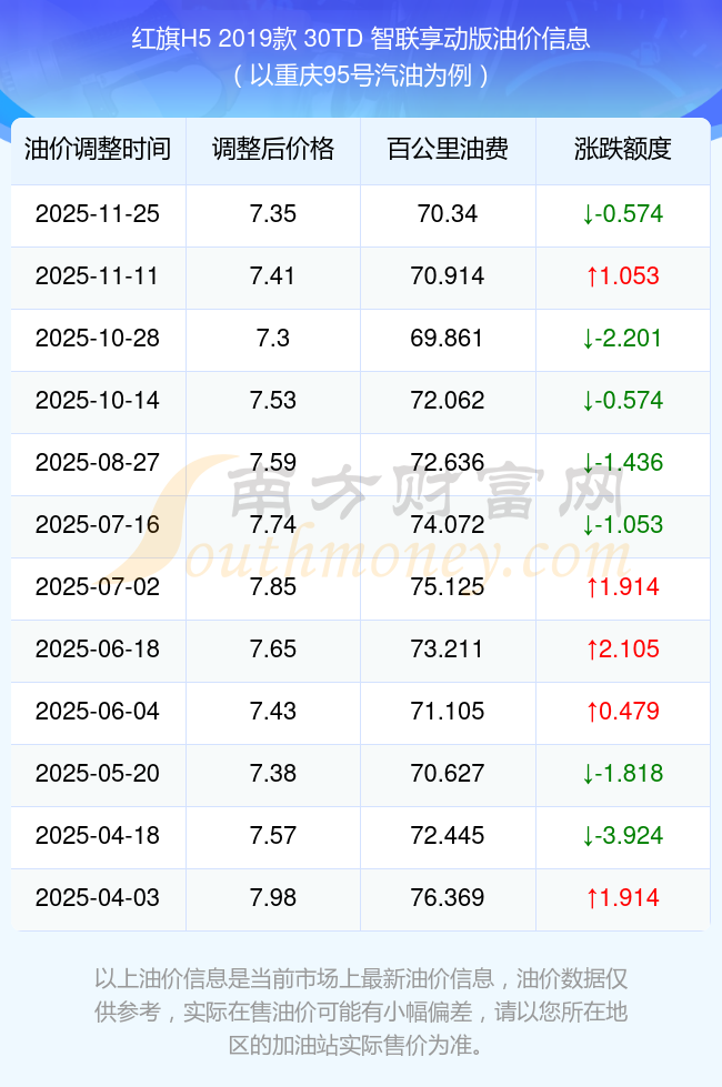 按11月25日95號(hào)汽油最新調(diào)整價(jià)格7.35元每升來計(jì)算(以重慶為例),該車型百公里平均油費(fèi)為70.34元,按上一輪11月11日調(diào)整價(jià)格7.41元每升來計(jì)算,百公里平均油費(fèi)為70.914元,對(duì)比上一輪少花0.574元,下一輪油價(jià)調(diào)整時(shí)間為12月8日24時(shí)。