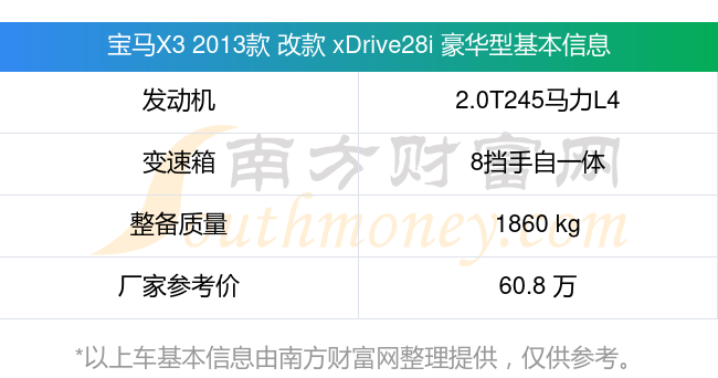 寶馬X3 2013款 改款 xDrive28i 豪華型動力上配備的是一臺2.0T245馬力L4渦輪增壓發(fā)動機,匹配的是8擋手自一體自動檔變速箱,燃料形式為汽油,常規(guī)整備質(zhì)量1860kg,廠家參考價60.8萬元。