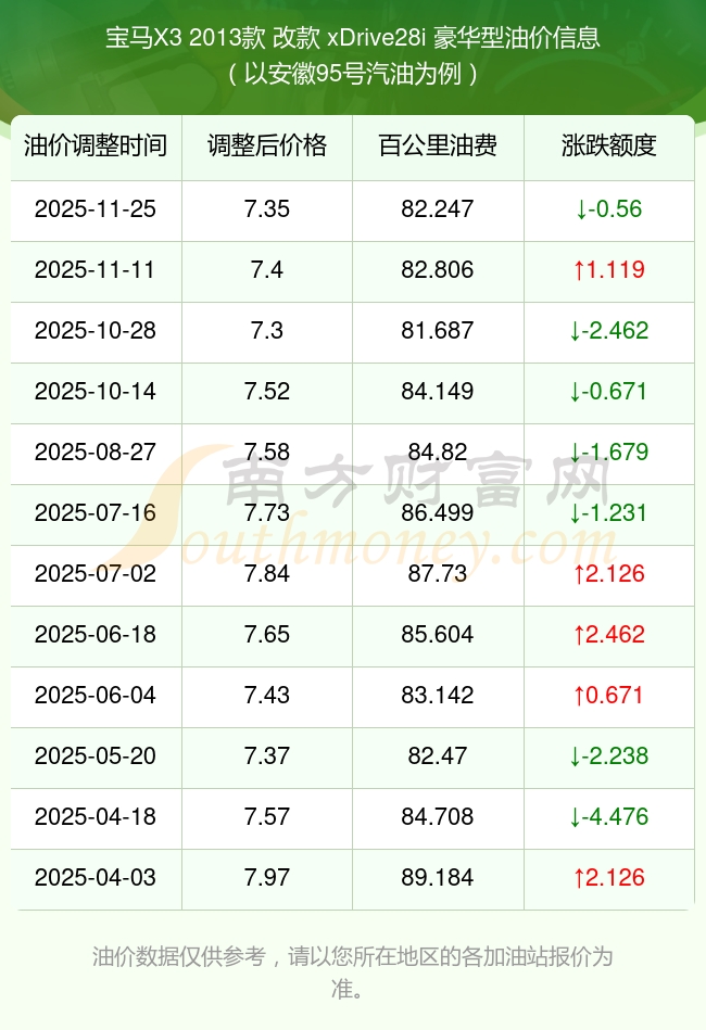 按照11月25日95號汽油最新調(diào)整價格7.35元/升來計算(以安徽為例),該車型百公里平均油費為82.247元,按照上一輪11月11日調(diào)整價格7.4元/升來計算,百公里平均油費為82.806元,對比上一輪少花0.56元,下一輪油價調(diào)整時間為12月8日24時。