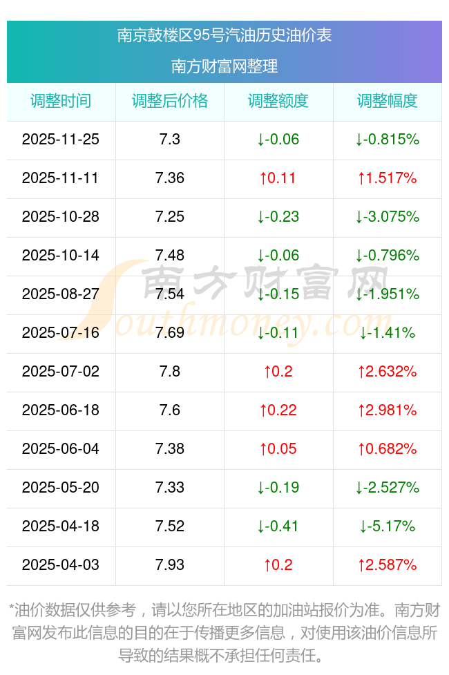 12月6日南京鼓樓區(qū)95號汽油歷史油價調(diào)整一覽表