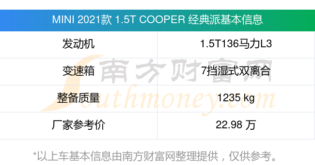 在動(dòng)力方面,MINI 2021款 1.5T COOPER 經(jīng)典派搭載的是一臺(tái)1.5T136馬力L3渦輪增壓發(fā)動(dòng)機(jī),匹配7擋濕式雙離合自動(dòng)檔變速箱,燃料形式為汽油,常規(guī)整備質(zhì)量1235kg,廠家參考價(jià)22.98萬元。