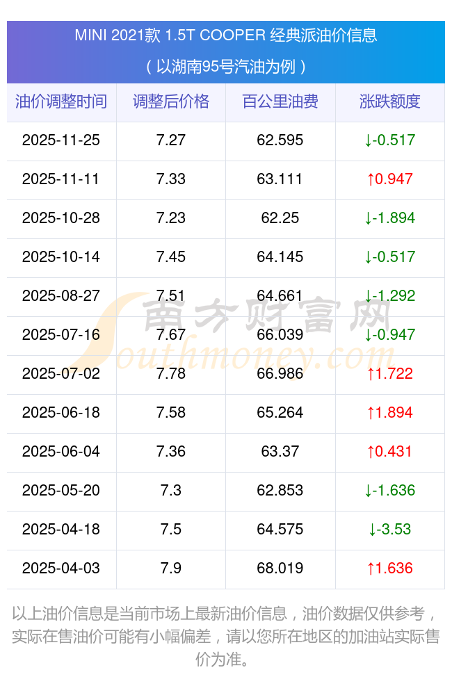 依照11月25日95號(hào)汽油最新調(diào)整價(jià)格7.27元/升來計(jì)算(以湖南為例),該車型百公里的平均油費(fèi)是62.595元,依照上一輪11月11日調(diào)整價(jià)格7.33元/升來計(jì)算,百公里的平均油費(fèi)是63.111元,對(duì)比上一輪少花0.517元,下一輪的油價(jià)調(diào)整時(shí)間12月8日24時(shí)。