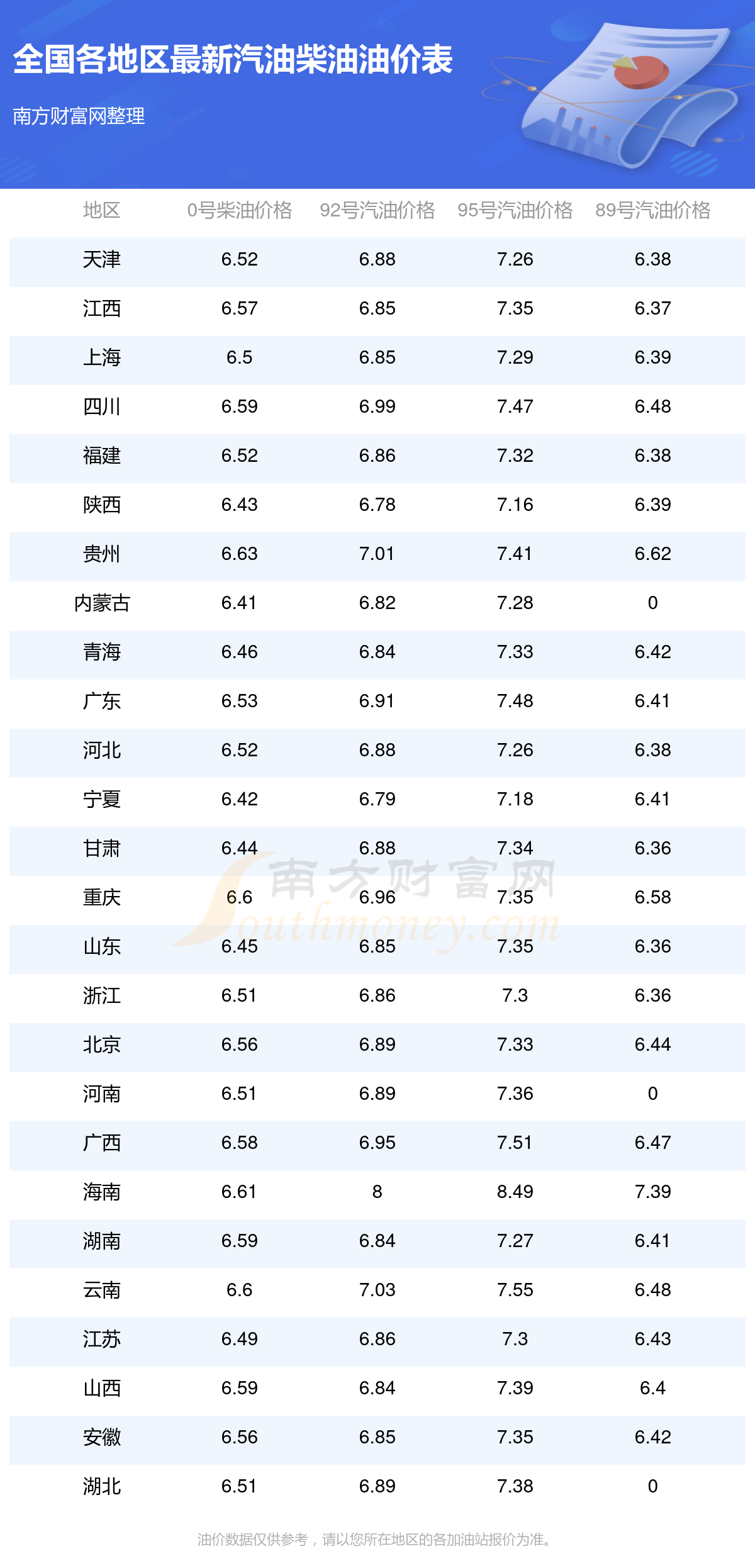 2025年全國(guó)各地區(qū)最新油價(jià)表