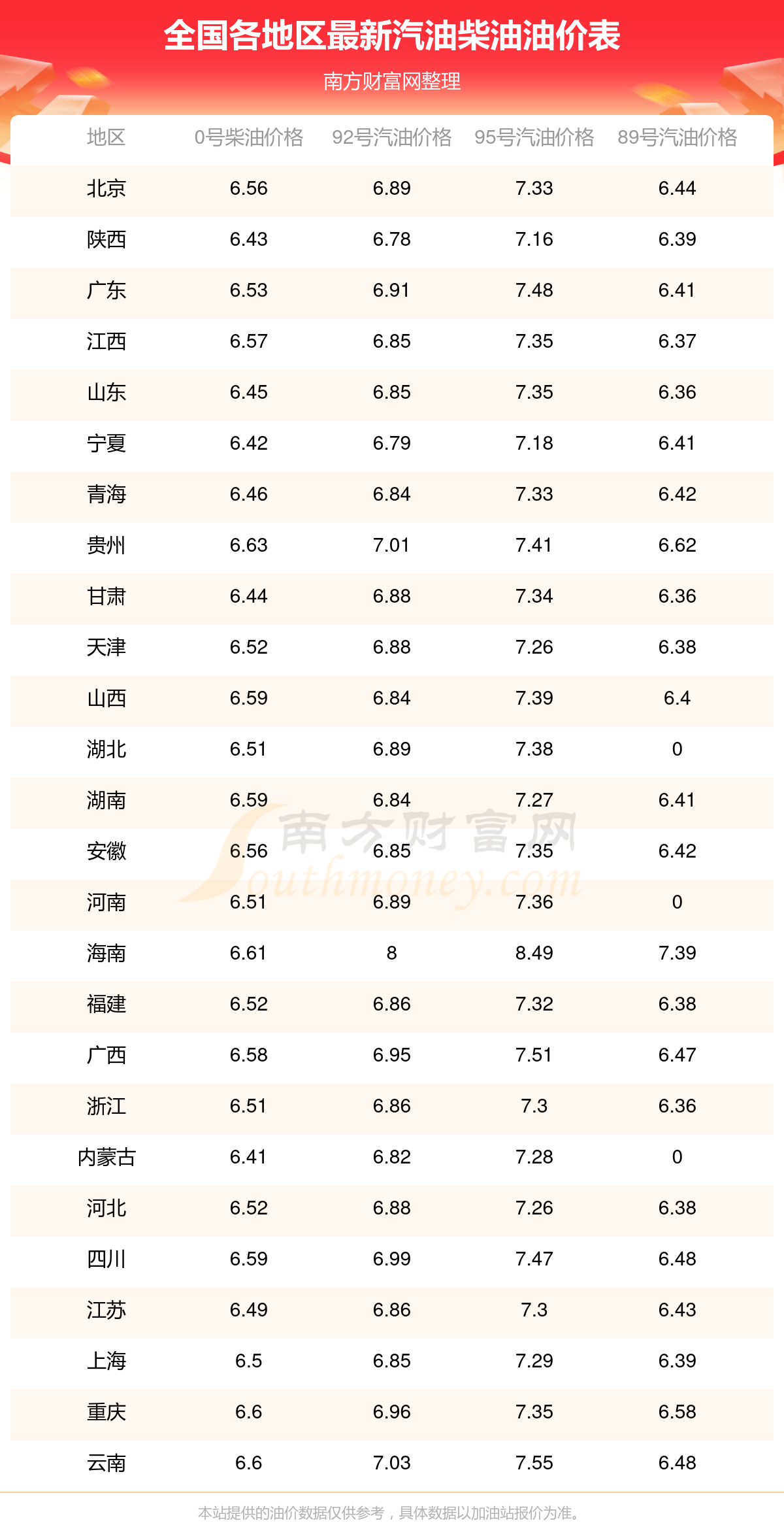 本次油價調(diào)整的時間為11月25日 ,調(diào)整后全國油價詳情如下: