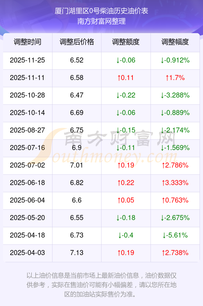 12月6日廈門湖里區(qū)0號(hào)柴油歷史油價(jià)一覽表