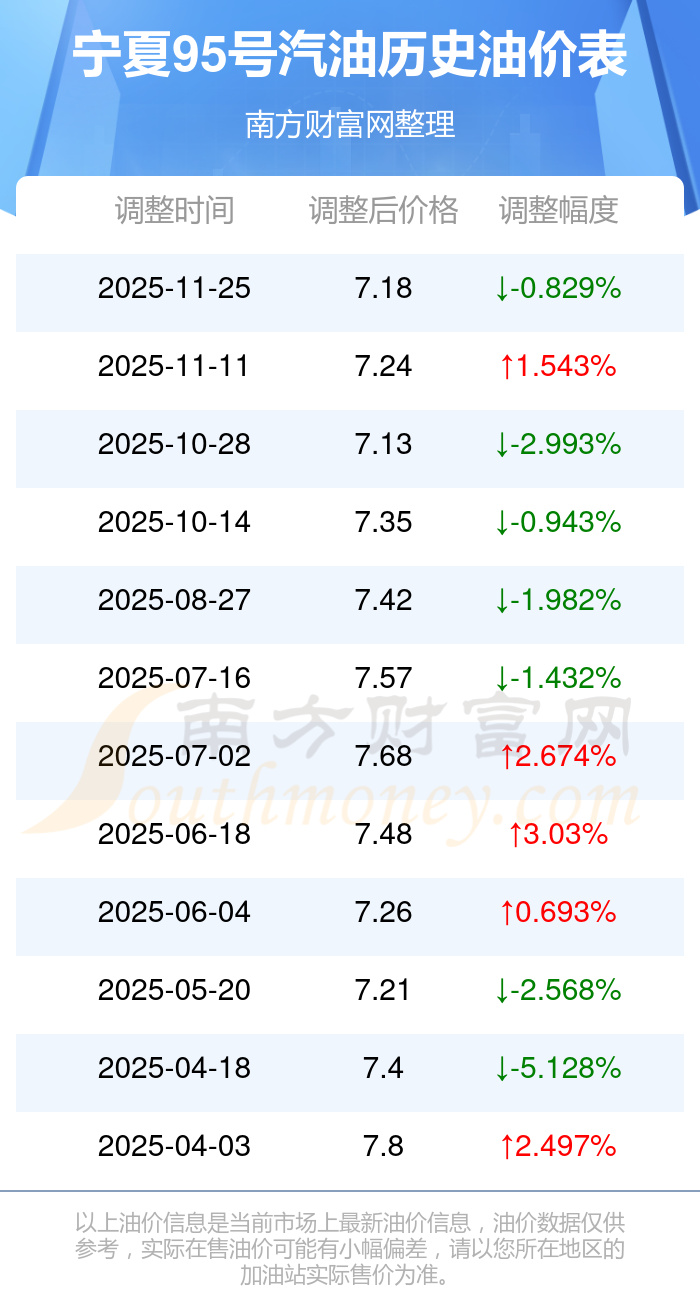 12月6日,寧夏95號(hào)汽油的價(jià)格是7.18元每升,本次的調(diào)整時(shí)間為11月25日,對(duì)比上次的調(diào)整降了0.06元,降0.829%,下次調(diào)整時(shí)間為12月8日24時(shí),還有2.39天。