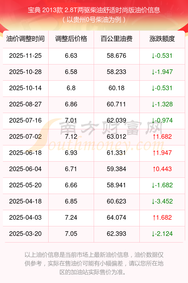 依照11月25日0號(hào)柴油最新調(diào)整價(jià)格6.63元/升來(lái)計(jì)算(以貴州為例),該車型百公里的平均油費(fèi)是58.676元,依照上一輪10月28日調(diào)整價(jià)格6.69元/升來(lái)計(jì)算,百公里的平均油費(fèi)是59.207元,對(duì)比上一輪少花0.531元,下一輪的油價(jià)調(diào)整時(shí)間12月8日24時(shí)。
