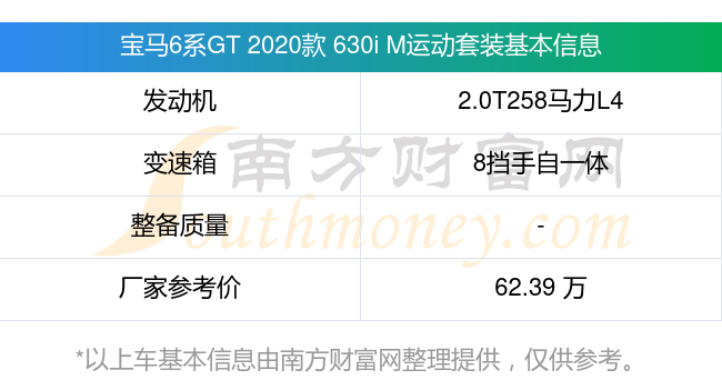 在動(dòng)力上,寶馬6系GT 2020款 630i M運(yùn)動(dòng)套裝配備的是一臺2.0T258馬力L4渦輪增壓發(fā)動(dòng)機(jī),匹配的是8擋手自一體自動(dòng)檔變速箱,燃料形式為汽油,廠家參考價(jià)62.39萬元。