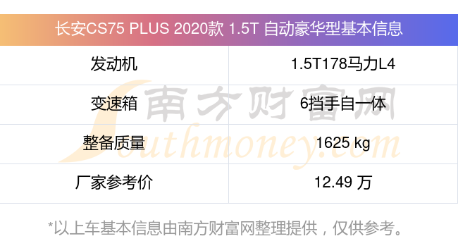 長(zhǎng)安CS75 PLUS 2020款 1.5T 自動(dòng)豪華型動(dòng)力方面,搭載的是一臺(tái)1.5T178馬力L4渦輪增壓發(fā)動(dòng)機(jī),匹配6擋手自一體自動(dòng)檔變速箱,燃料形式為汽油,常規(guī)整備質(zhì)量1625kg,廠家參考價(jià)12.49萬(wàn)元。