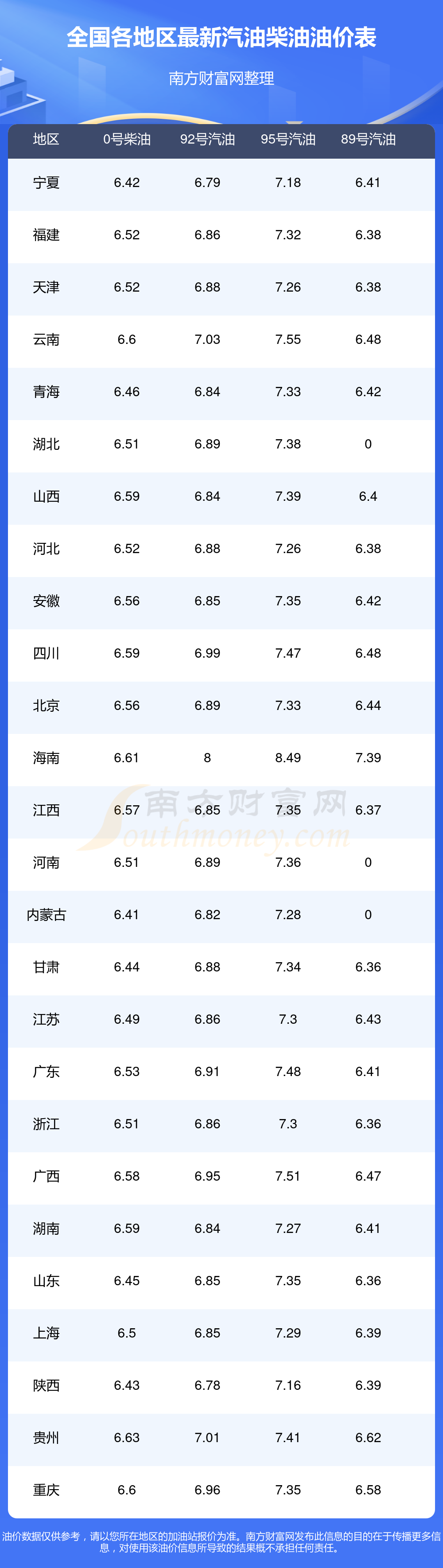 全國(guó)各地區(qū)12月6日汽油價(jià)格表
