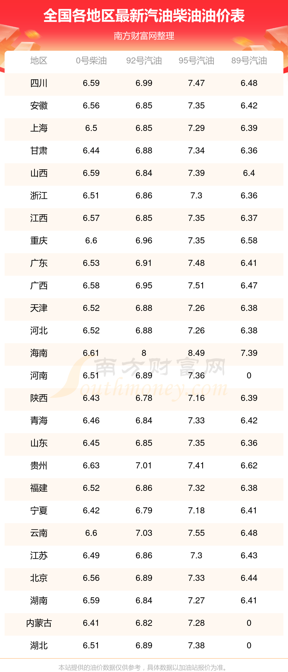 油價數(shù)據(jù)僅供參考,請以您所在地區(qū)的加油站報價為準。南方財富網(wǎng)發(fā)布此信息的目的在于傳播更多信息,對使用該油價信息所導(dǎo)致的結(jié)果概不承擔任何責任。