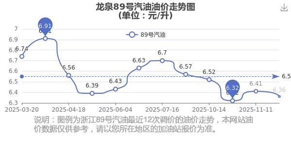 龍泉汽油、柴油12月6日每升的價格為11月25日調(diào)整后的價格,具體油價為:92號汽油6.86元;95號汽油7.3元;89號汽油6.36元;0號柴油6.51元。