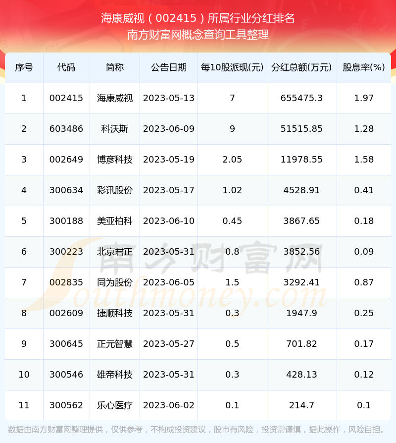 按照南方財(cái)富網(wǎng)趨勢(shì)選股系統(tǒng)統(tǒng)計(jì),??低曀鶎傩袠I(yè)為計(jì)算機(jī)設(shè)備行業(yè),計(jì)算機(jī)設(shè)備行業(yè)分紅排名情況如下表: