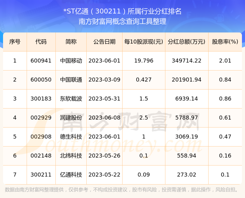 按照南方財(cái)富網(wǎng)趨勢選股系統(tǒng)統(tǒng)計(jì),*ST億通所屬行業(yè)為通信服務(wù)行業(yè),通信服務(wù)行業(yè)分紅排名情況如下表: