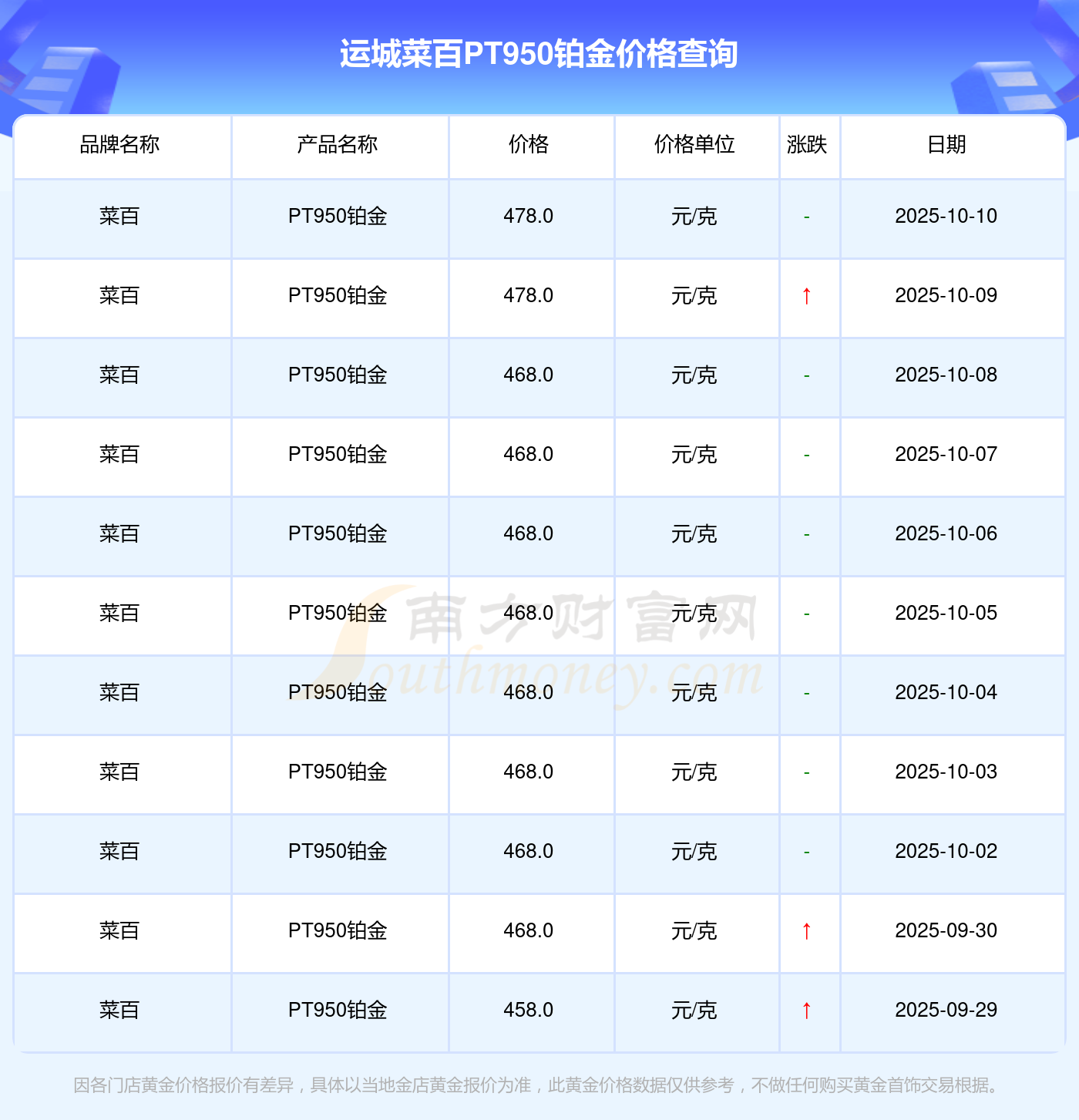 2025年10月12日運城菜百PT950鉑金現(xiàn)在每克多少錢?