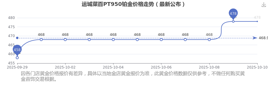 運城菜百在 2025年10月12日的PT950鉑金零售價格為 478.0元/克。