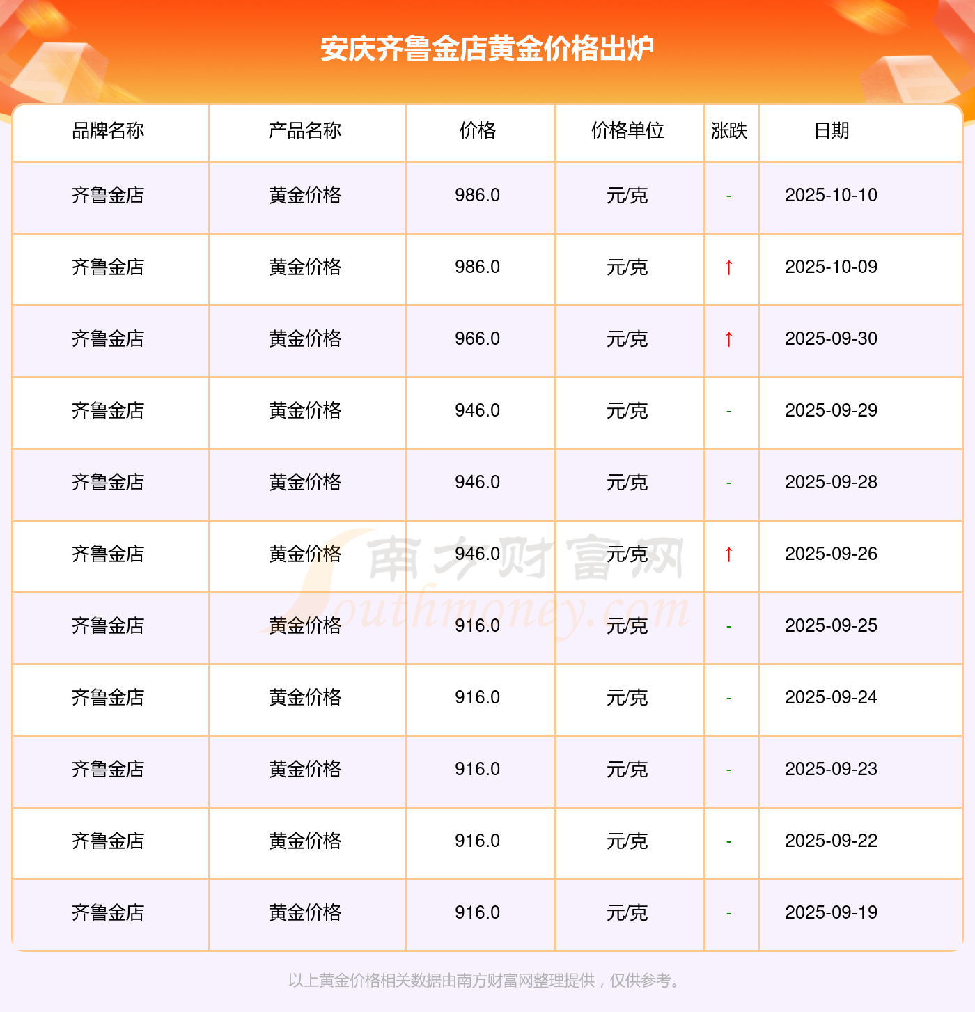安慶齊魯金店 2025年10月12日的黃金價(jià)格價(jià)位為 986.0元/克。