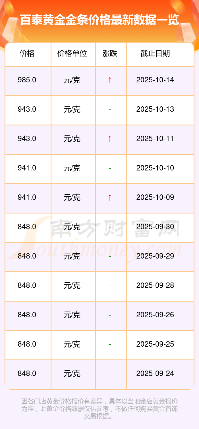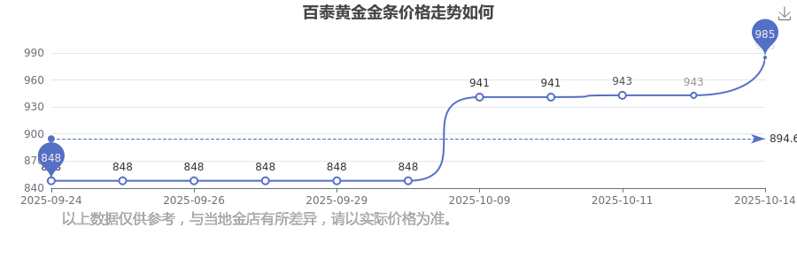 985.0元/克成為百泰黃金今日 金條價(jià)格的最新交易的價(jià)格。