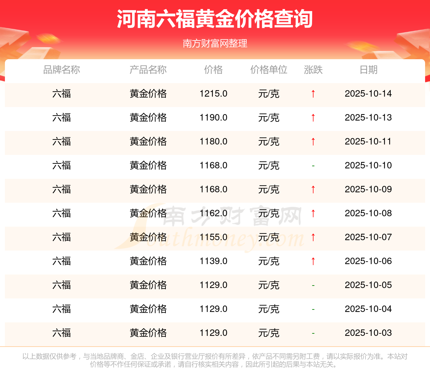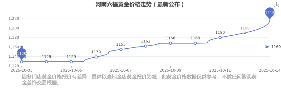 今日(2025年10月14日)河南六福黃金價(jià)格最新價(jià)格為1215.0元/克。