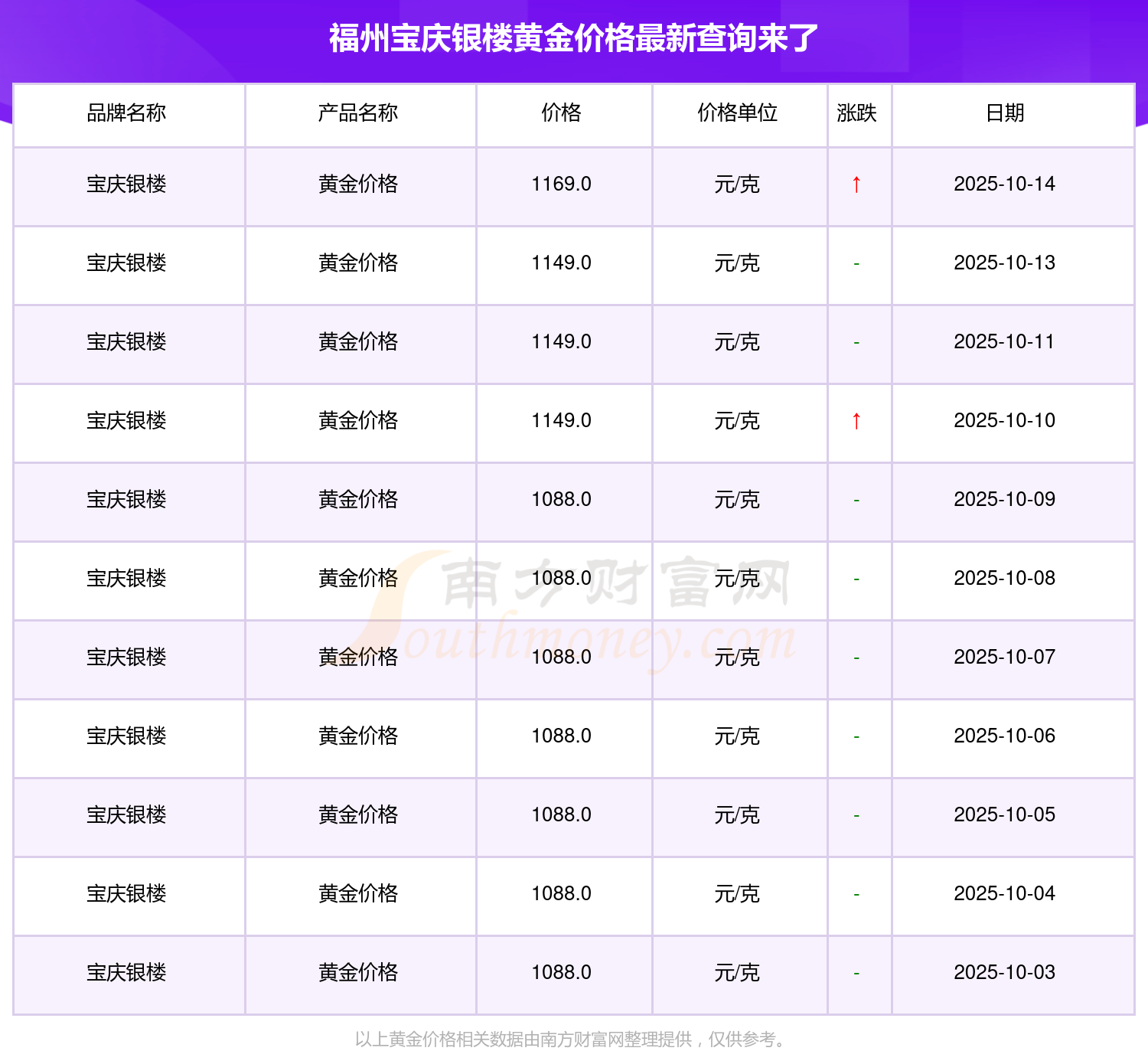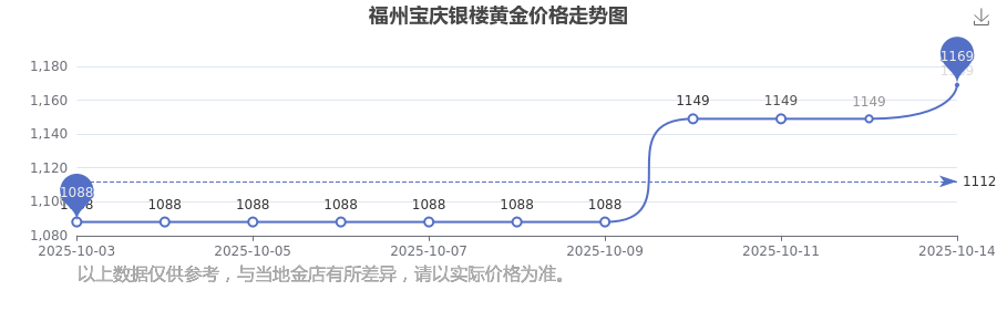 福州寶慶銀樓黃金價(jià)格在 2025年10月14日,其市場價(jià)格為 1169.0元/克。