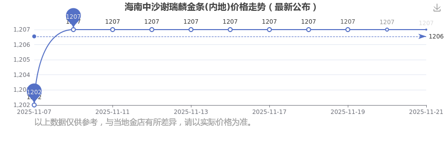 今日海南中沙謝瑞麟金條(內(nèi)地)價(jià)格是1207.0元/克。