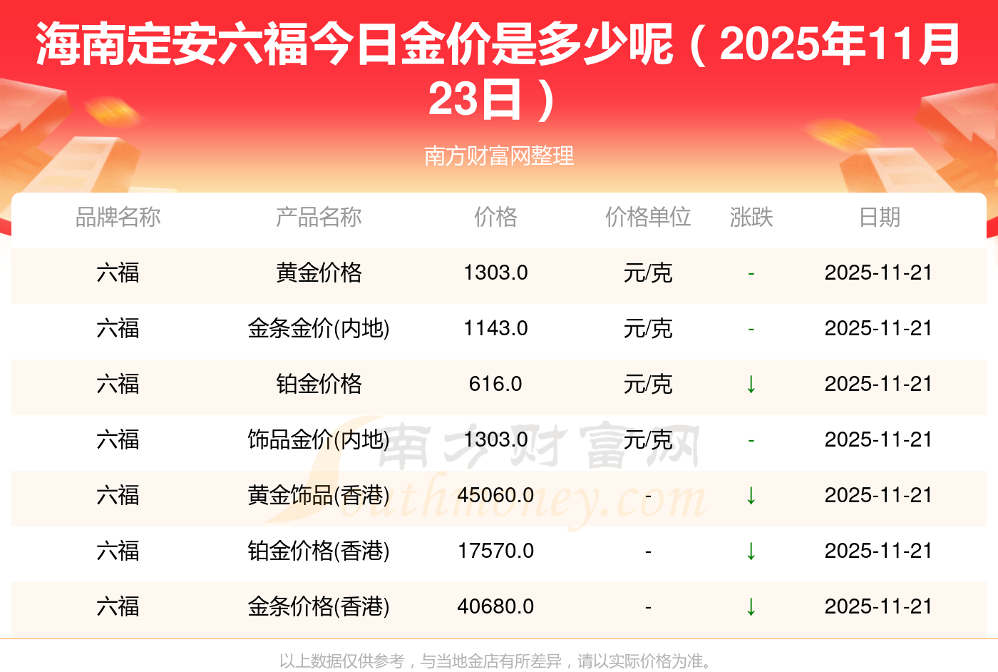 黃金價(jià)格1305.0元/克,鉑金價(jià)格616.0元/克,飾品金價(jià)(內(nèi)地)1305.0元/克,黃金飾品(香港)45110.0,鉑金價(jià)格(香港)17570.0,金條價(jià)格(香港)40690.0,金條金價(jià)(內(nèi)地)1143.0元/克,黃金價(jià)格1298.0元/克,鉑金價(jià)格600.0元/克,足金價(jià)格1298.0元/克,黃金價(jià)格1266.0元/克。