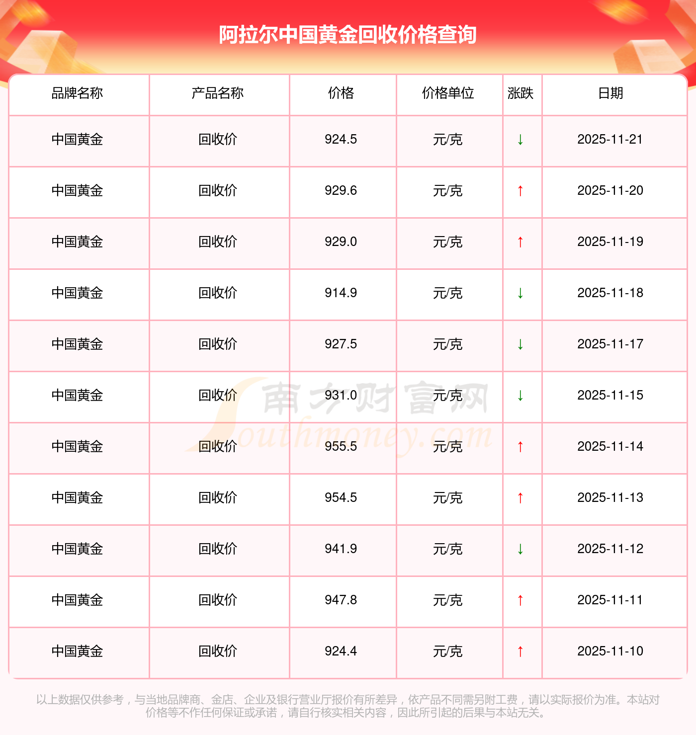 阿拉爾中國(guó)黃金 2025年11月23日的回收價(jià)價(jià)位為 924.5元/克。