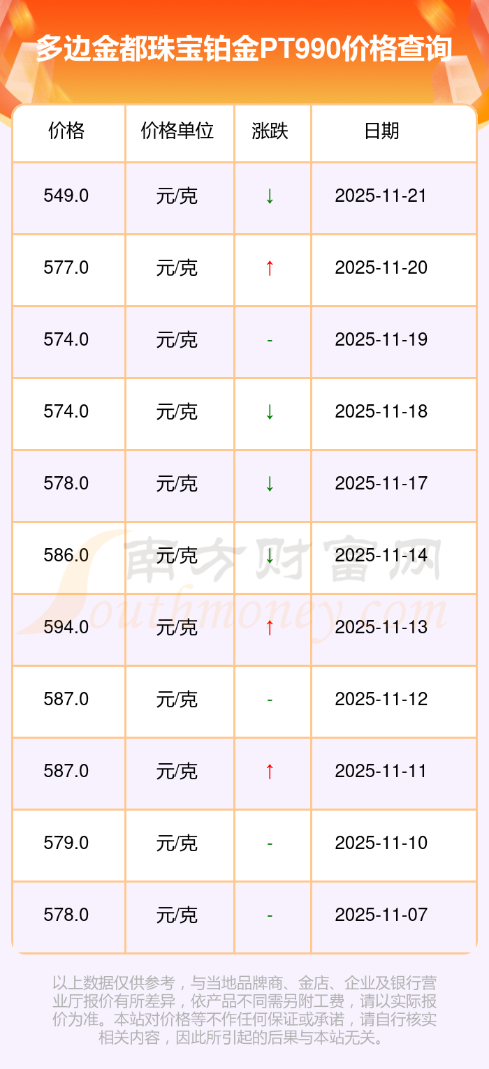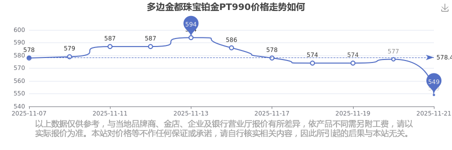 今日(2025年11月23日)多邊金都珠寶鉑金PT990的價(jià)格為549.0元/克。