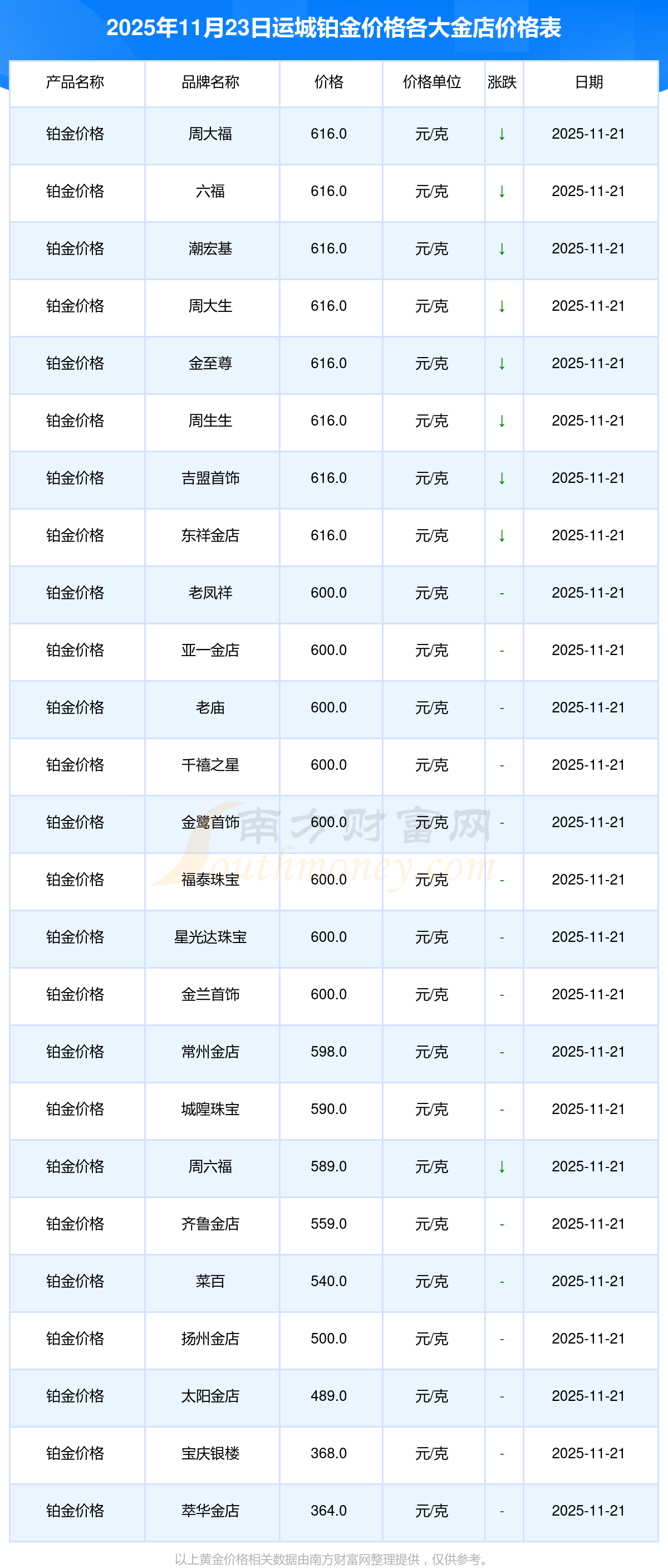 2025年11月23日運城各大金店鉑金價格最新價格:周大福1305.0元/克,周大福616.0元/克,周大福1305.0元/克,周大福45110.0,周大福17570.0,周大福40690.0,周大福1143.0元/克,老鳳祥1298.0元/克,老鳳祥600.0元/克,老鳳祥1298.0元/克,周六福1266.0元/克。
