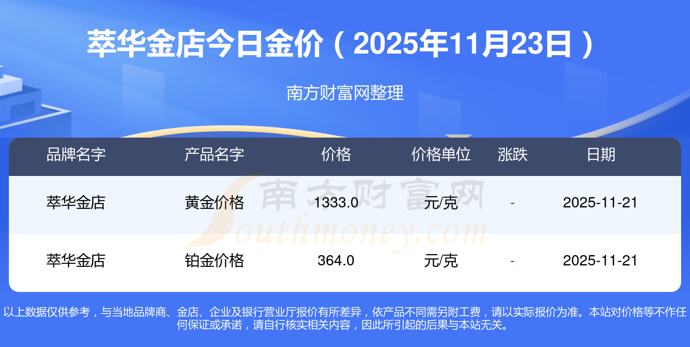 萃華金店今日金價(jià)的具體數(shù)字是怎樣的?數(shù)據(jù)來了:黃金價(jià)格1305.0元/克,鉑金價(jià)格616.0元/克,飾品金價(jià)(內(nèi)地)1305.0元/克,黃金飾品(香港)45110.0,鉑金價(jià)格(香港)17570.0,金條價(jià)格(香港)40690.0,金條金價(jià)(內(nèi)地)1143.0元/克,黃金價(jià)格1298.0元/克,鉑金價(jià)格600.0元/克,足金價(jià)格1298.0元/克,黃金價(jià)格1266.0元/克。