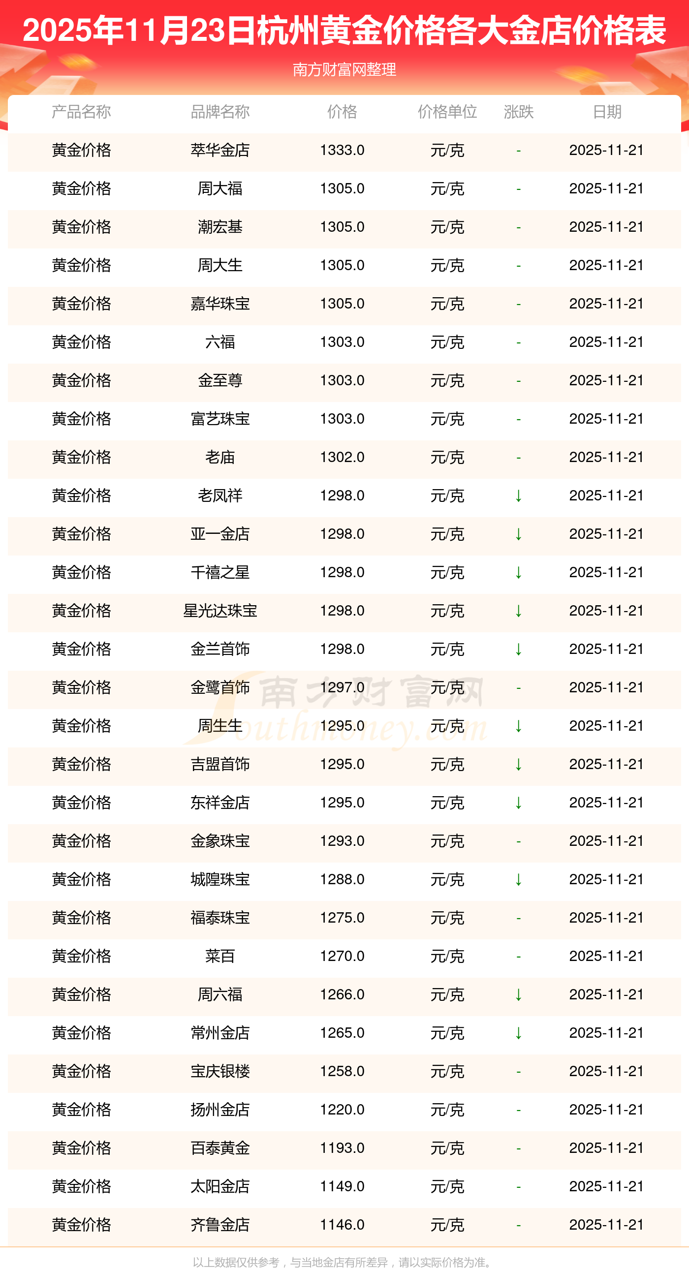 2025年11月23日杭州周大福、周大福、周大福、周大福、周大福、周大福、周大福、老鳳祥、老鳳祥、老鳳祥、周六福等各大金店品牌黃金價格最新價格行情來了,如下:周大福黃金價格1305.0元/克,周大福鉑金價格616.0元/克,周大福飾品金價(內(nèi)地)1305.0元/克,周大福黃金飾品(香港)45110.0,周大福鉑金價格(香港)17570.0,周大福金條價格(香港)40690.0,周大福金條金價(內(nèi)地)1143.0元/克,老鳳祥黃金價格1298.0元/克,老鳳祥鉑金價格600.0元/克,老鳳祥足金價格1298.0元/克,周六福黃金價格1266.0元/克。