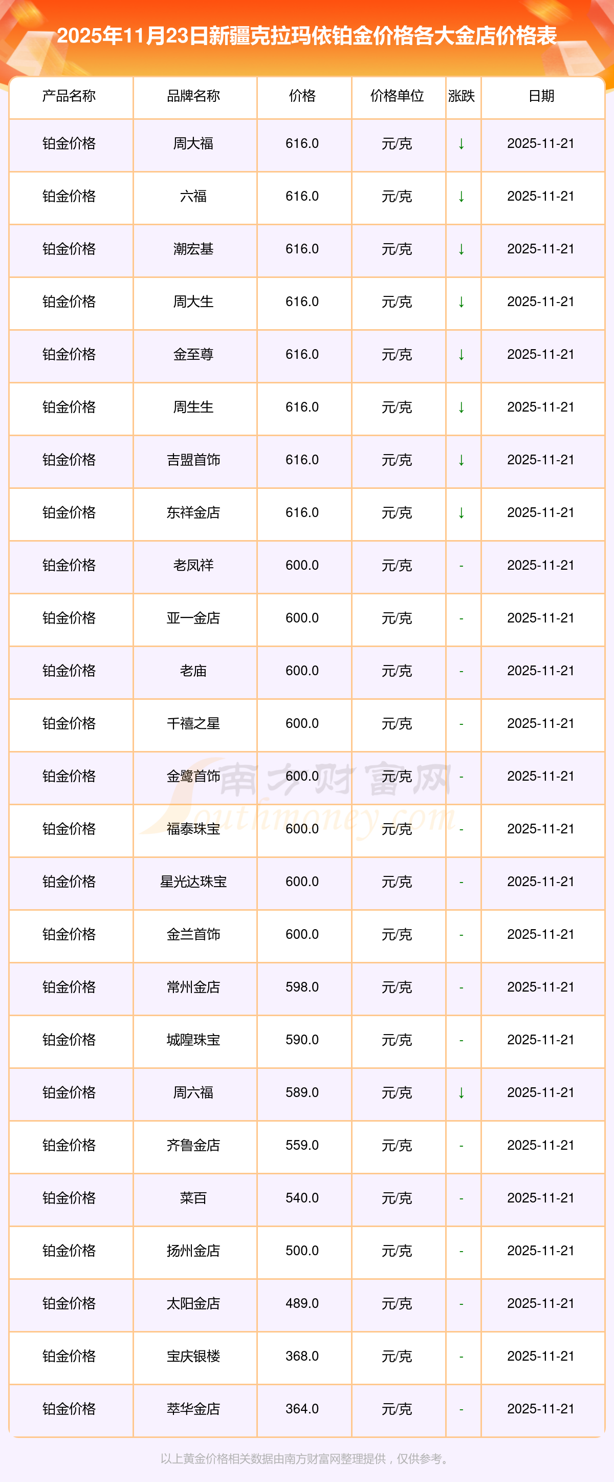2025年11月23日新疆克拉瑪依各大金店鉑金價格最新價格:周大福1305.0元/克,周大福616.0元/克,周大福1305.0元/克,周大福45110.0,周大福17570.0,周大福40690.0,周大福1143.0元/克,老鳳祥1298.0元/克,老鳳祥600.0元/克,老鳳祥1298.0元/克,周六福1266.0元/克。