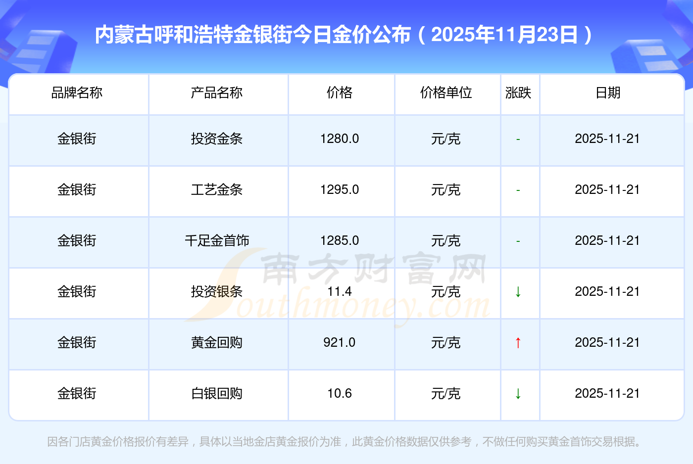 2025年11月23日內(nèi)蒙古呼和浩特金銀街一克黃金的售價(jià)是多少:黃金價(jià)格1305.0元/克,鉑金價(jià)格616.0元/克,飾品金價(jià)(內(nèi)地)1305.0元/克,黃金飾品(香港)45110.0,鉑金價(jià)格(香港)17570.0,金條價(jià)格(香港)40690.0,金條金價(jià)(內(nèi)地)1143.0元/克,黃金價(jià)格1298.0元/克,鉑金價(jià)格600.0元/克,足金價(jià)格1298.0元/克,黃金價(jià)格1266.0元/克。