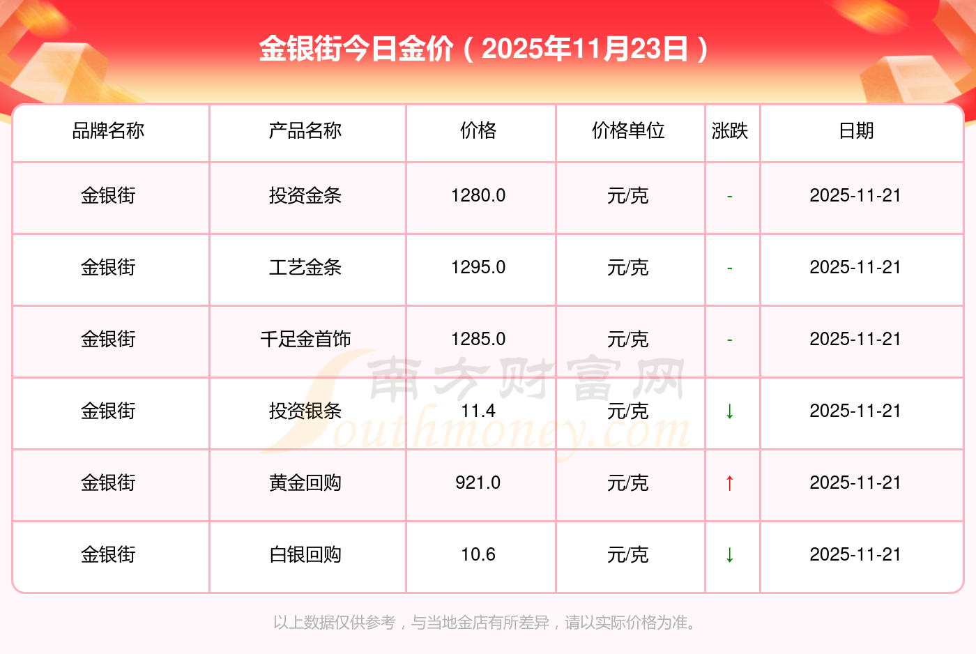 現(xiàn)在金銀街黃金價格是多少錢1克_2025年金銀街今日金價是多少錢一克,最新金銀街查詢,2025年11月23日金銀街黃金回購現(xiàn)在每克多少錢?最新金銀街黃金回購報價公布,一起來看看吧!