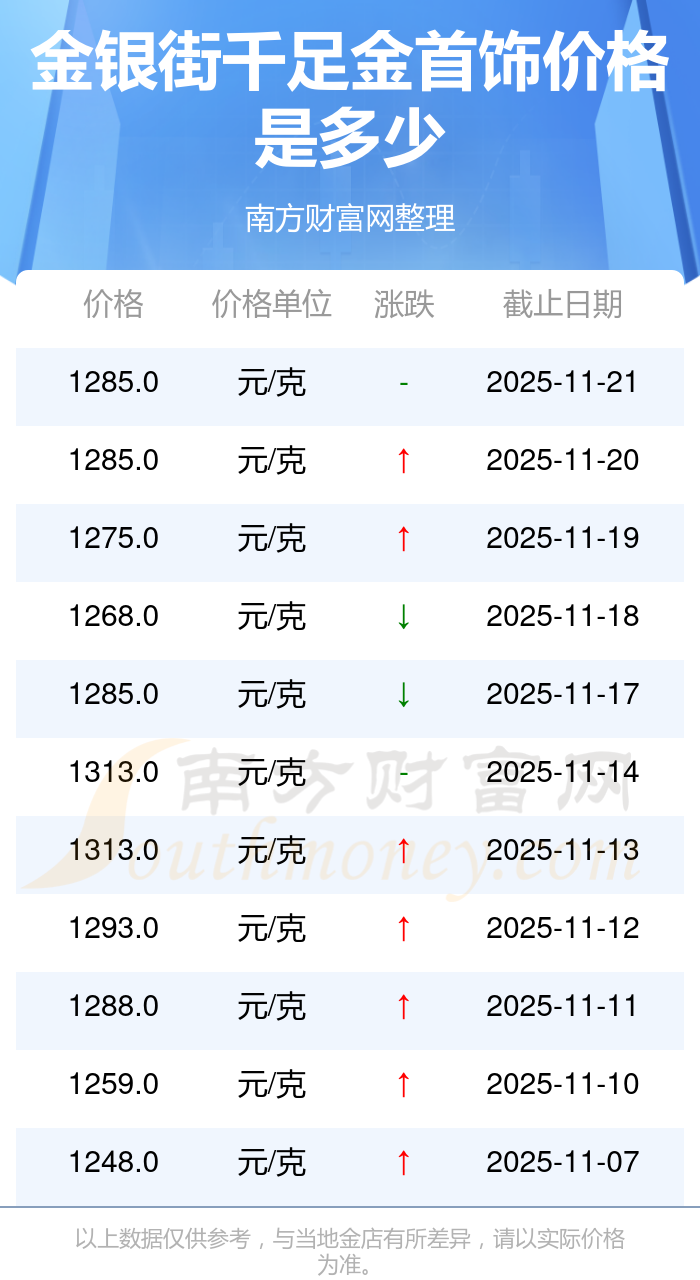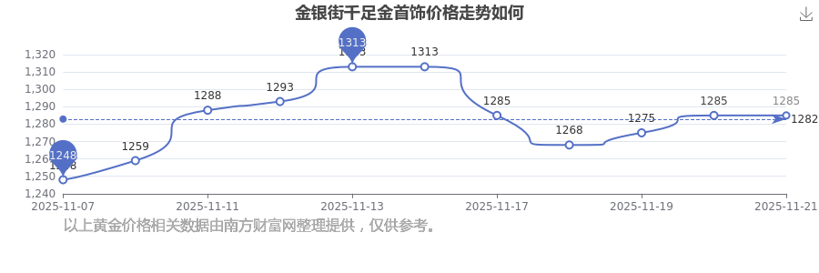 今日金銀街千足金首飾價(jià)格最新是1285.0元/克。