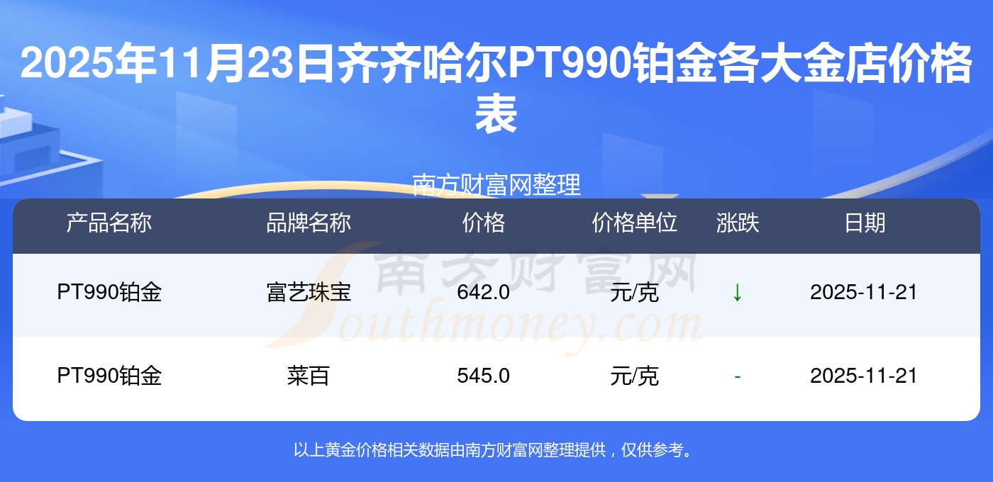 2025年11月23日齊齊哈爾各大金店P(guān)T990鉑金最新價(jià)格:周大福1305.0元/克,周大福616.0元/克,周大福1305.0元/克,周大福45110.0,周大福17570.0,周大福40690.0,周大福1143.0元/克,老鳳祥1298.0元/克,老鳳祥600.0元/克,老鳳祥1298.0元/克,周六福1266.0元/克。
