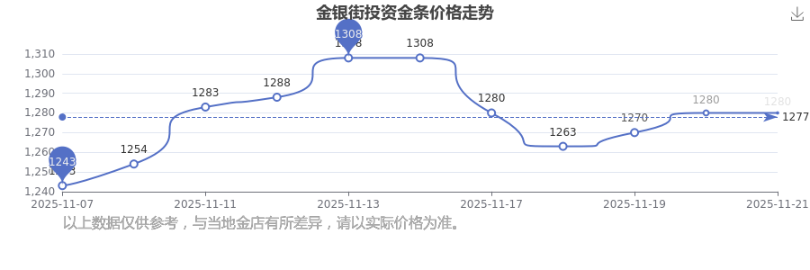 金銀街 投資金條在今日的最新價(jià)格顯示為1280.0元/克。
