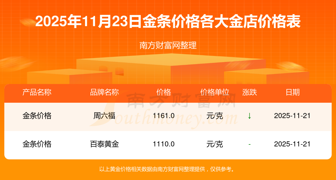 2025年11月23日,周大福、周大福、周大福、周大福、周大福、周大福、周大福、老鳳祥、老鳳祥、老鳳祥、周六福等各大金店品牌金條價(jià)格今日價(jià)格如下:周大福1305.0元/克、周大福616.0元/克、周大福1305.0元/克、周大福45110.0、周大福17570.0、周大福40690.0、周大福1143.0元/克、老鳳祥1298.0元/克、老鳳祥600.0元/克、老鳳祥1298.0元/克、周六福1266.0元/克。