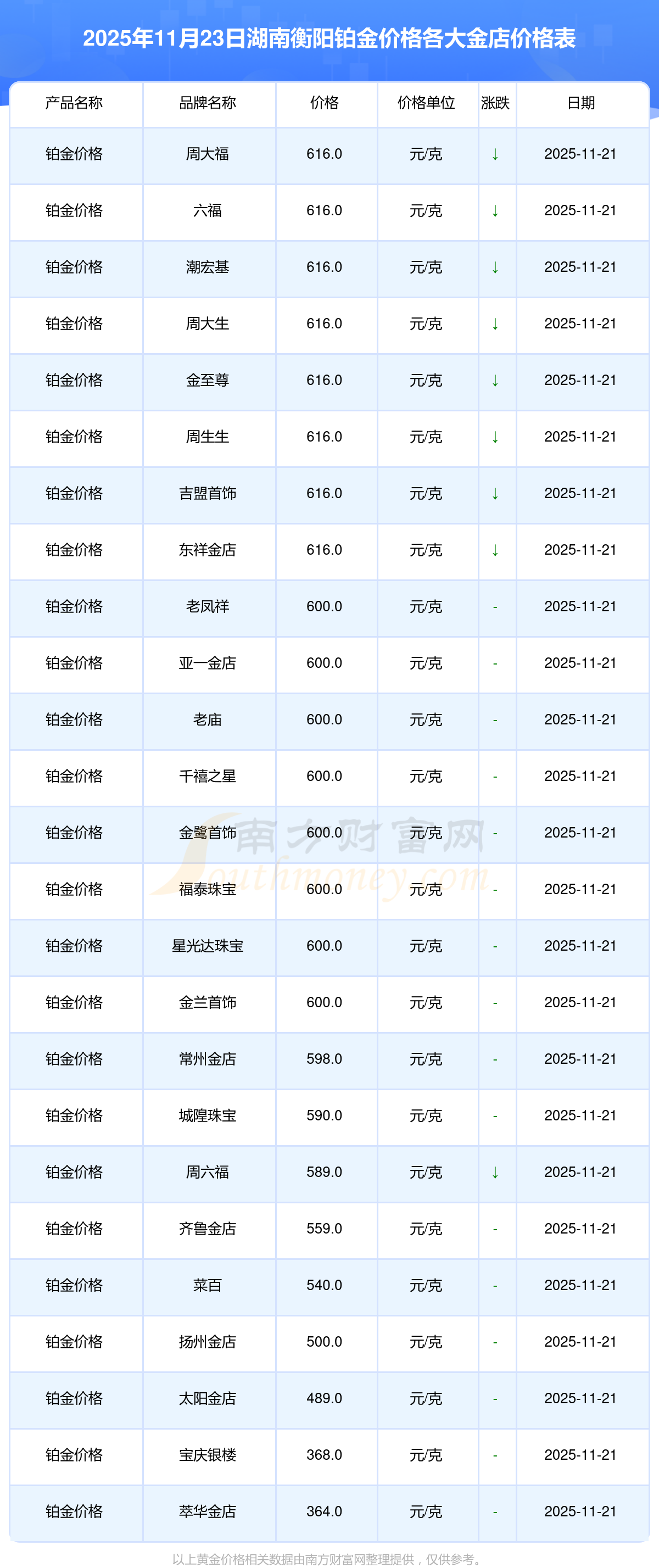 2025年11月23日湖南衡陽各大金店鉑金價格最新價格查詢來了:周大福1305.0元/克,周大福616.0元/克,周大福1305.0元/克,周大福45110.0,周大福17570.0,周大福40690.0,周大福1143.0元/克,老鳳祥1298.0元/克,老鳳祥600.0元/克,老鳳祥1298.0元/克,周六福1266.0元/克。