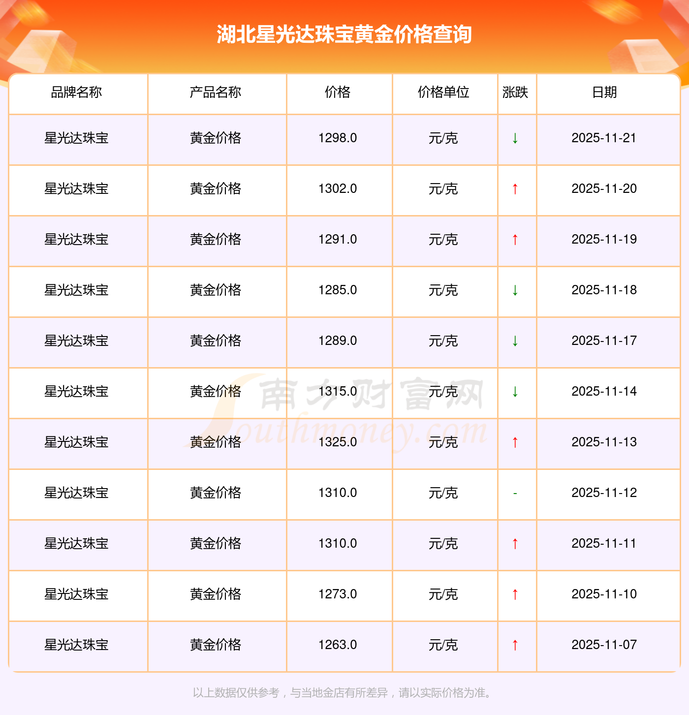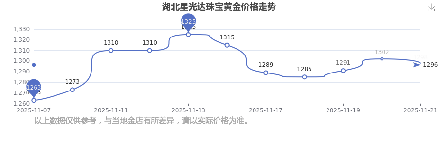 2025年11月23日當(dāng)天,湖北星光達珠寶黃金價格的單價是 1298.0元/克。