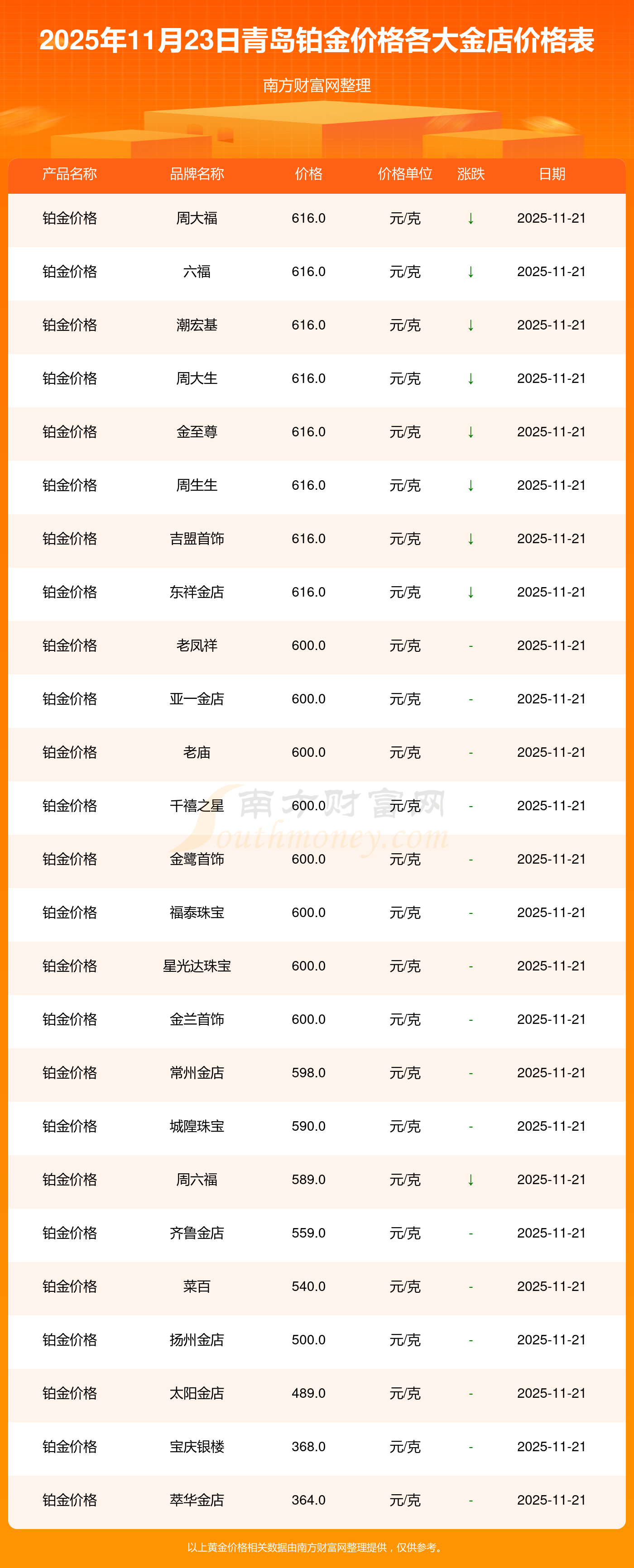 今天是2025年11月23日,青島周大福、周大福、周大福、周大福、周大福、周大福、周大福、老鳳祥、老鳳祥、老鳳祥、周六福等各大金店品牌鉑金價(jià)格最新價(jià)格如下:周大福1305.0元/克、周大福616.0元/克、周大福1305.0元/克、周大福45110.0、周大福17570.0、周大福40690.0、周大福1143.0元/克、老鳳祥1298.0元/克、老鳳祥600.0元/克、老鳳祥1298.0元/克、周六福1266.0元/克。