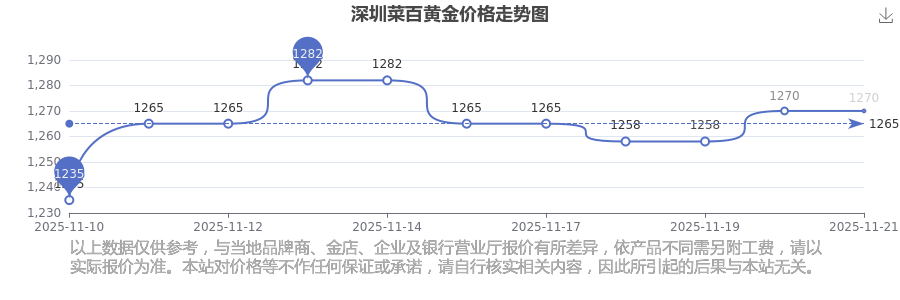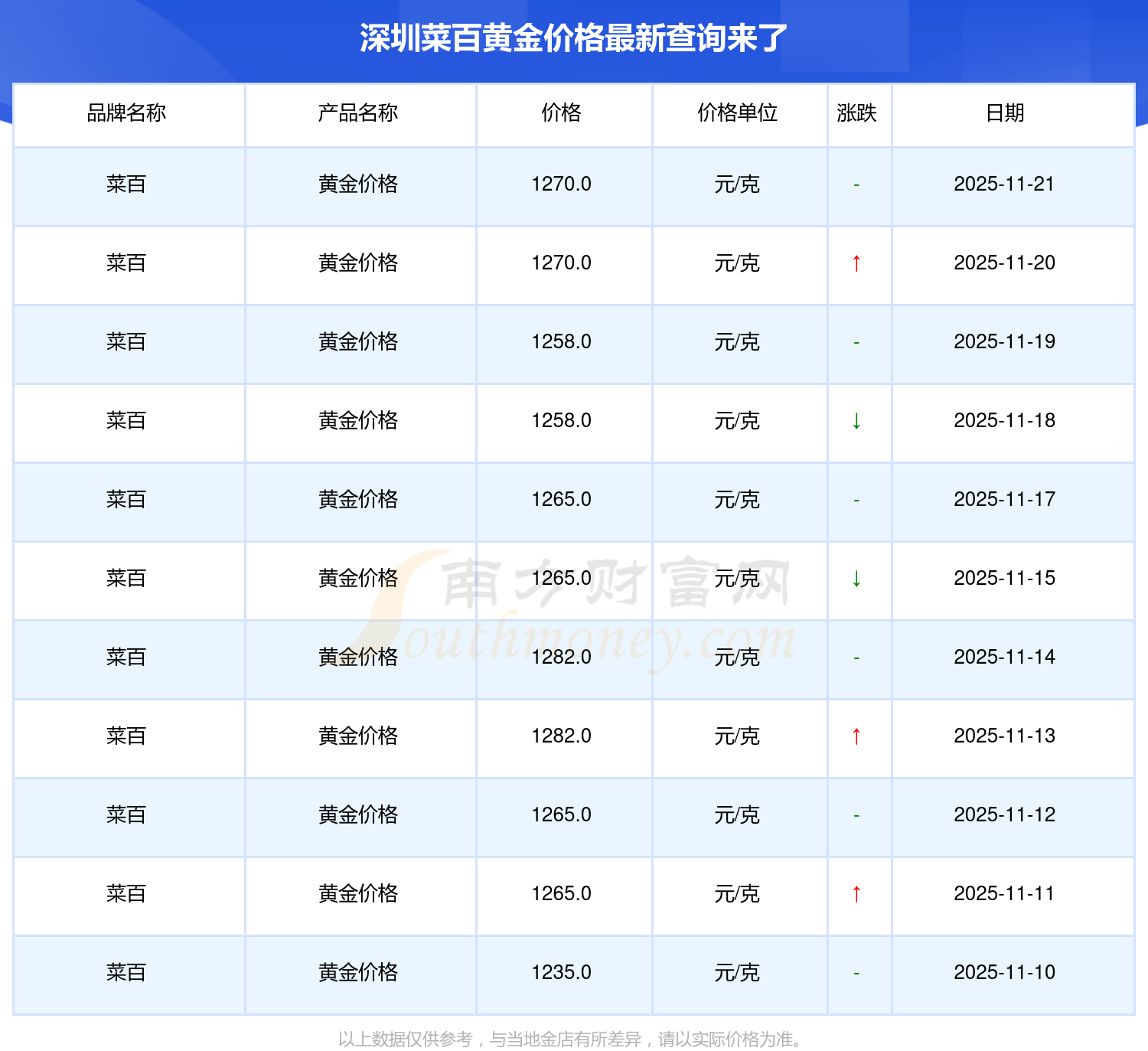 于 2025年11月23日,深圳菜百黃金價(jià)格的克價(jià)為1270.0元/克。